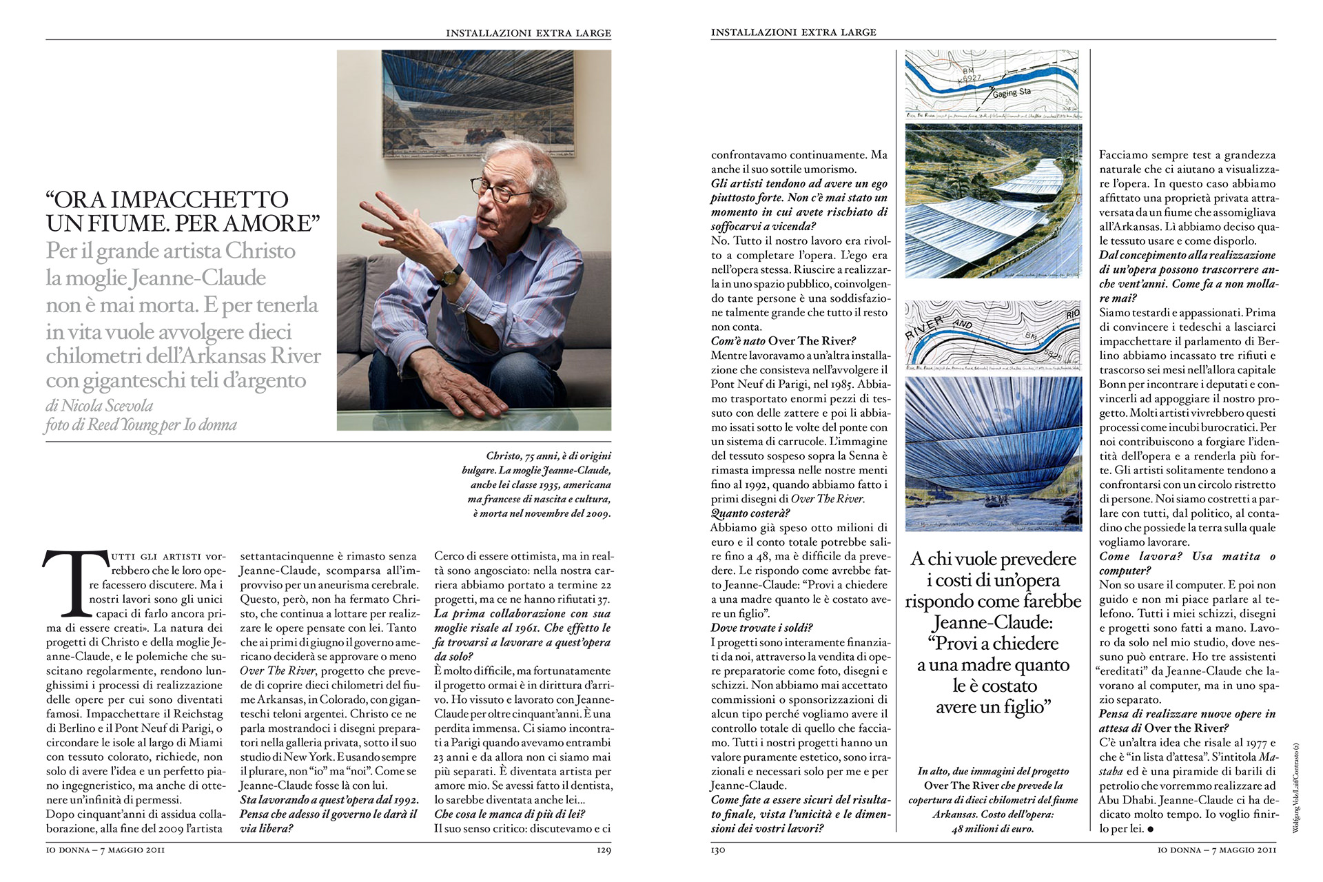 “Tutti gli artisti vorrebbero che le loro opere facessero discutere. Ma i nostri lavori sono gli unici capaci di farlo ancora prima di essere creati”. La natura dei progetti di Christo e Jean Claude, e le polemiche che suscitano regolarmente, rendono lunghissimi i processi di realizzazione delle opere che li hanno resi famosi. Impacchettare il Reichstag tedesco e il Pont Neuf di Parigi, o circondare le isole al largo di Miami con tessuto colorato richiede un’infinità di permessi burocratici, oltre ad un’idea geniale e un buon piano ingegneristico. Dopo cinquant’anni di assidua collaborazione, alla fine del 2009 l’artista settantacinquenne è rimasto solo quando la moglie Jean Claude è scomparsa all’improvviso per un aneurisma cerebrale. Questo, però, non ha fermato Christo dal continuare a lottare per realizzare le opere pensate insieme a lei. L’ultima delle quali sta per andare incontro al suo giudizio finale: ai primi di giugno il governo americano deciderà se approvare Over The River, progetto che prevede di coprire dieci chilometri del fiume Arkansas, in Colorado, con giganteschi teloni argentei sospesi nell’aria.