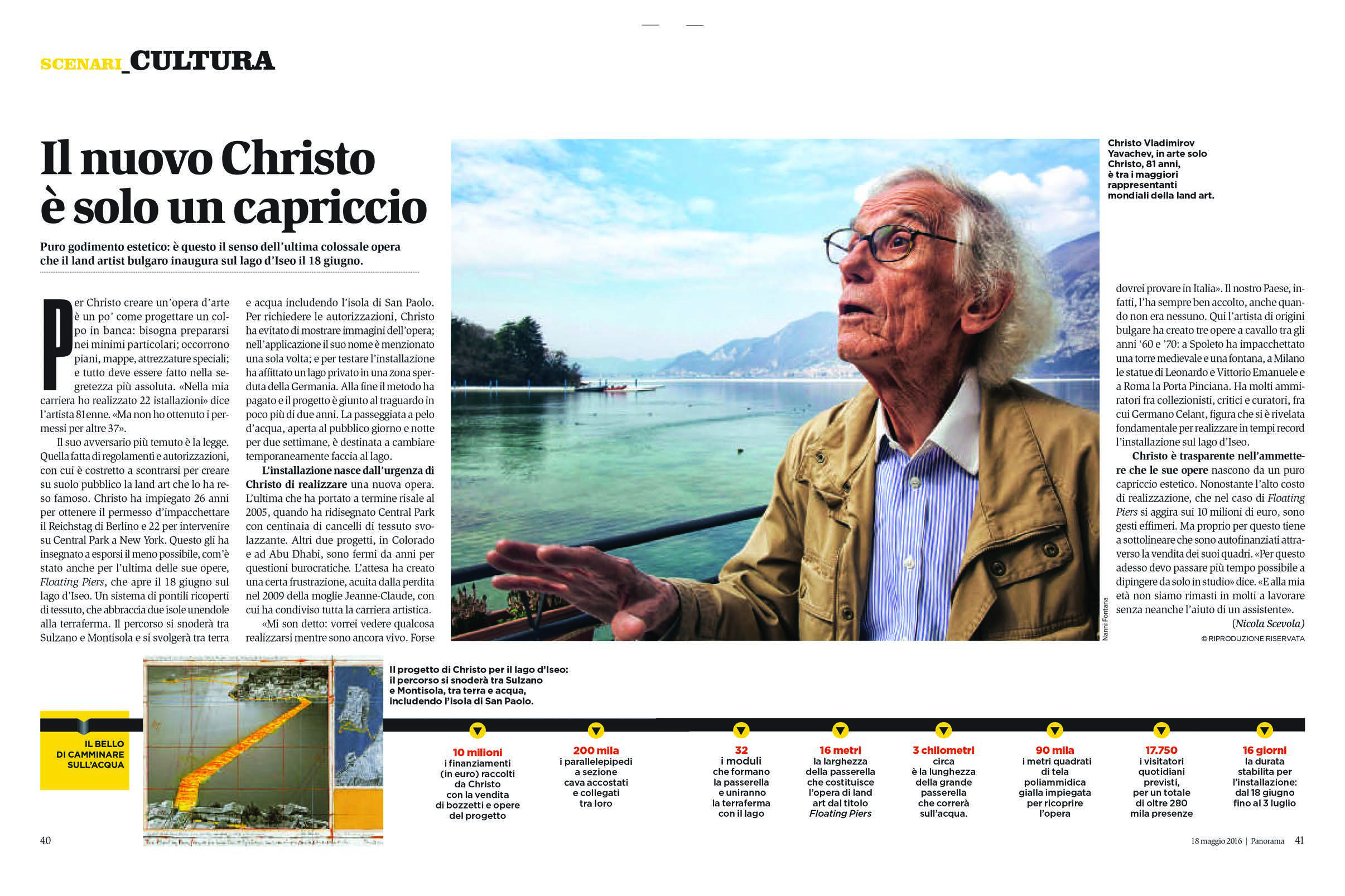 Per Christo creare un’opera d’arte è un po’ come progettare un colpo in banca: bisogna prepararsi nei minimi particolari; occorrono piani, mappe, attrezzature speciali; e tutto deve essere fatto nella segretezza più assoluta. “Nella mia carriera ho realizzato 22 istallazioni”, dice l’artista 81enne. “Ma non ho ottenuto i permessi per altre 37”. Il suo avversario più temuto è la legge. Non quella penale, ovviamente. Ma quella amministrativa, fatta di regolamenti e autorizzazioni, con cui è costretto a scontrarsi per creare su suolo pubblico la land art che lo ha reso famoso. Christo ha impiegato 26 anni per ottenere il permesso d’impacchettare il Reichstag e 22 per intervenire su Central Park. Questo gli ha insegnato a esporsi il meno possibile, com’è stato anche per l’ultima delle sue opere, Floating Piers, che apre a metà giugno sul lago d’Iseo. Un sistema di pontili ricoperti di tessuto, che abbraccia due isole unendole alla terraferma. Per richiedere le autorizzazioni, Christo ha evitato di mostrare immagini dell’opera; nell’applicazione il suo nome è menzionato una sola volta; e per testare l’istallazione, ha affittato un lago privato in una zona sperduta della Germania. Alla fine, però, il metodo ha pagato e il progetto è giunto al traguardo in poco più di due anni. La passeggiata a pelo d’acqua, aperta al pubblico giorno e notte per tre settimane, sarà lunga più di tre chilometri ed è destinata a cambiare temporaneamente faccia al lago.
