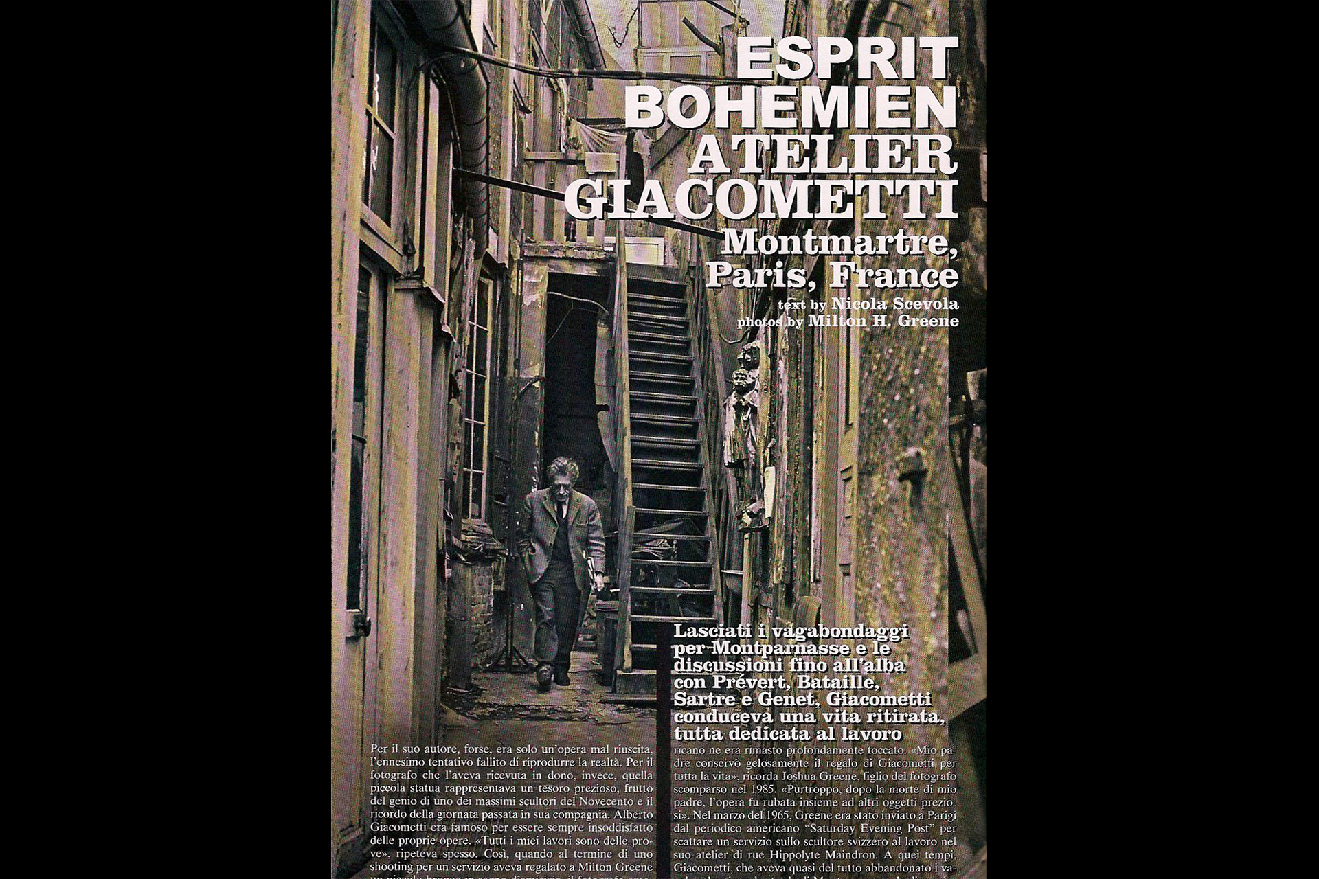 Per il suo autore era forse solo un’opera malriuscita, l’ennesimo tentativo fallito di riprodurre la realtà. Per il fotografo che l’aveva ricevuta in dono, invece, quella piccola statua rappresentava un tesoro prezioso, frutto del genio di uno dei migliori scultori del Novecento e ricordo della piacevole giornata passata in sua compagnia. Alberto Giacometti era famoso per essere sempre insoddisfatto delle sue opere. “Tutti i miei lavori sono delle prove”, continuava a ripetere mentre musei e gallerie di tutto il mondo facevano a gara per aggiudicarsi i suoi pezzi. E quando, al termine di uno shooting per un servizio, aveva regalato a Milton Greene un piccolo bronzo in segno d’amicizia, il fotografo americano ne era rimasto lusingato. “Mio padre conservò gelosamente il regalo di Giacometti per tutta la vita”, dice Joshua Greene, figlio 55enne del famoso fotografo americano, scomparso nel 1985. “Purtroppo dopo la sua morte la statua fu rubata insieme ad altri oggetti preziosi”. Nel marzo del 1965, Greene era stato inviato a Parigi per scattare un servizio sullo scultore svizzero nel suo laboratorio di Rue Hippolyte Maindron. A quei tempi, Giacometti non batteva quasi più le strade di Montparnasse fermandosi a discutere fino all’alba insieme a Prévert, Bataille, Sartre e Genet. Lo scultore, che sarebbe morto dopo meno di un anno, viveva ormai un’esistenza ritirata, dedicandosi interamente al suo lavoro. Per facilitare quindi l’incontro fra l’artista e il fotografo, che doveva illustrare un articolo per il periodico americano Saturday Evening Post, era stato chiesto ad un amico di Giacometti, Henri Cartier-Bresson, di introdurre il collega americano. I due fotografi si diedero appuntamento in un caffè di Montparnasse, poco distante dal laboratorio di Giacometti.