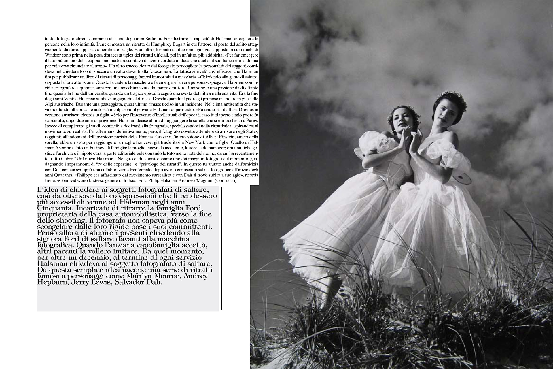 Per affermarsi definitivamente, però, il fotografo dovette attendere lo sbarco negli Stati Uniti, avvenuto all’indomani dell’invasione nazista della Francia. Grazie all’intercessione di Albert Einstein, amico della sorella, ottenne un visto per raggiungere la moglie francese, che nel frattempo si era trasferita a New York. Quello di Halsman è sempre stato un business di famiglia: la moglie faceva da assistente e la sorella da manager; ora una figlia gestisce il suo archivio e il nipote cura la parte editoriale, selezionando le foto meno note del nonno, da cui ha recentemente tratto il libro Unknown Halsman. Nel giro di due anni dall’arrivo in Usa, il fotografo divenne uno dei più richiesti del momento, guadagnando il soprannome di “psicologo dei ritratti”. In questo fu aiutato anche dall’amicizia con Salvador Dalì con cui sviluppò una collaborazione trentennale, dopo averlo conosciuto sul set fotografico all’inizio degli anni Quaranta. “Philippe era affascinato dal movimento surrealista e con Dalì si trovò subito a suo agio”, ricorda la figlia Irene. “Condividevano lo stesso genere di follia”. © Nicola Scevola