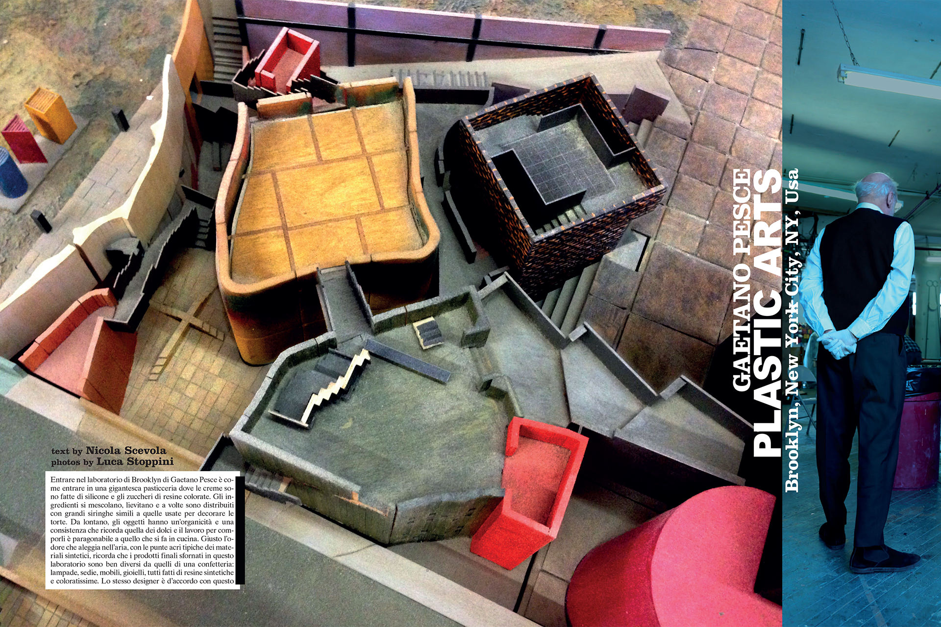Entrando nel suo regno di Brooklyn, situato in una zona industriale del vecchio porto militare, si è inevitabilmente colpiti dall’esplosione di colori che contrasta con il grigiore esterno, rafforzando l’impressione di essere in una fucina di delizie. Lo spazio è invaso da materiali cangianti e multiformi affastellati ovunque: prototipi, modelli, barili di resine, calchi, torni, scalpelli. Dentro c’è una squadra di assistenti sempre al lavoro, mentre Pesce si divide fra il laboratorio e lo studio di SoHo, che affaccia su Broadway. Le idee per i suoi progetti spesso sono concepite nello spazio di Manhattan, ma è qui a Brooklyn che sono realizzate concretamente. Questo obbliga il designer – famoso per gli oggetti creati per aziende di arredamento come Cassina, Vitra e B&B – a fare continuamente da spola fra i due luoghi.“Finalmente i taxi di hanno accettato di portare clienti anche a Brooklyn. Una volta non volevano, era come chiedergli di superare le colonne d’Ercole. E per me era un problema”.