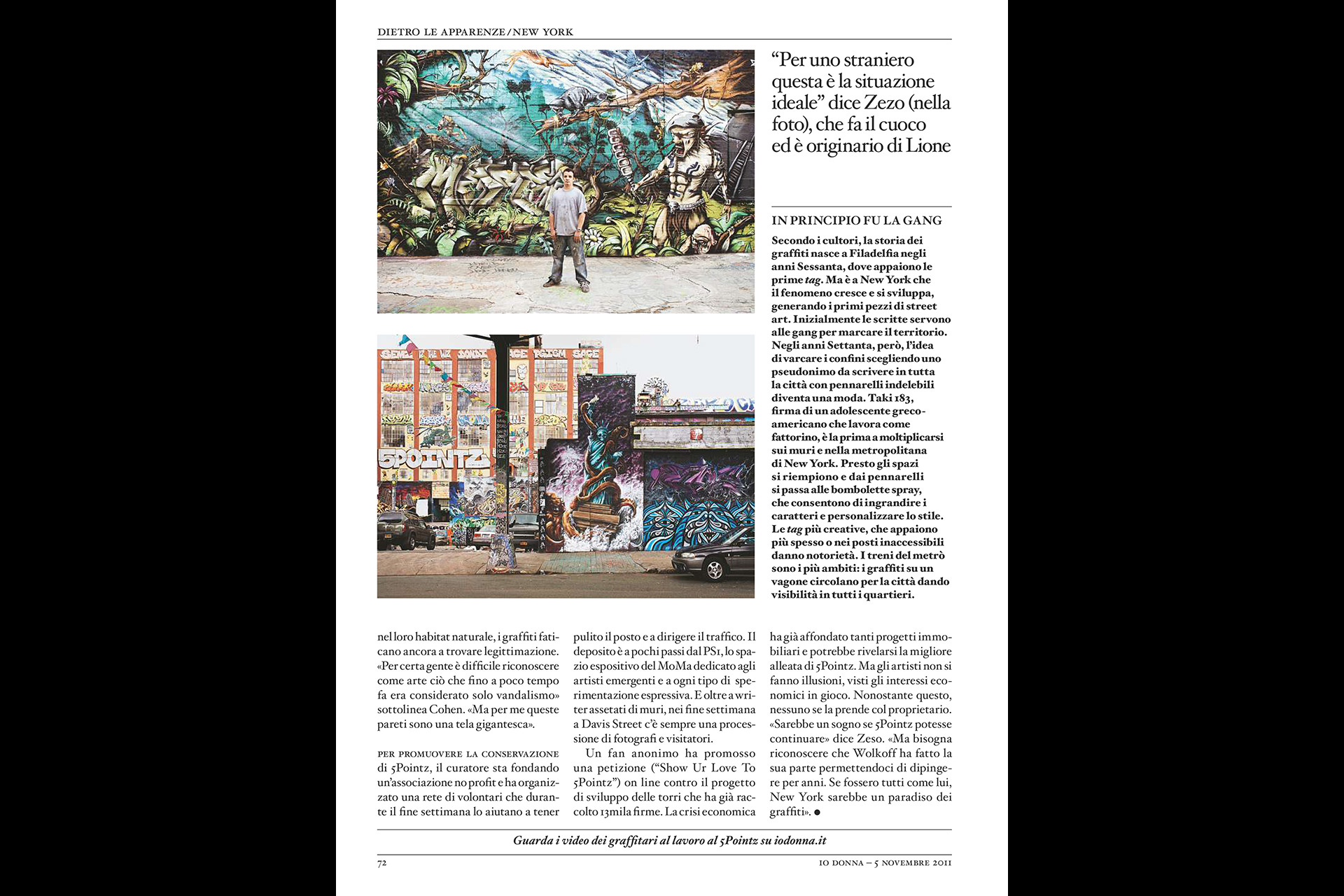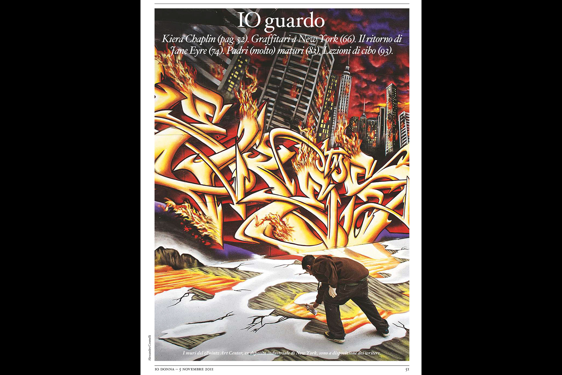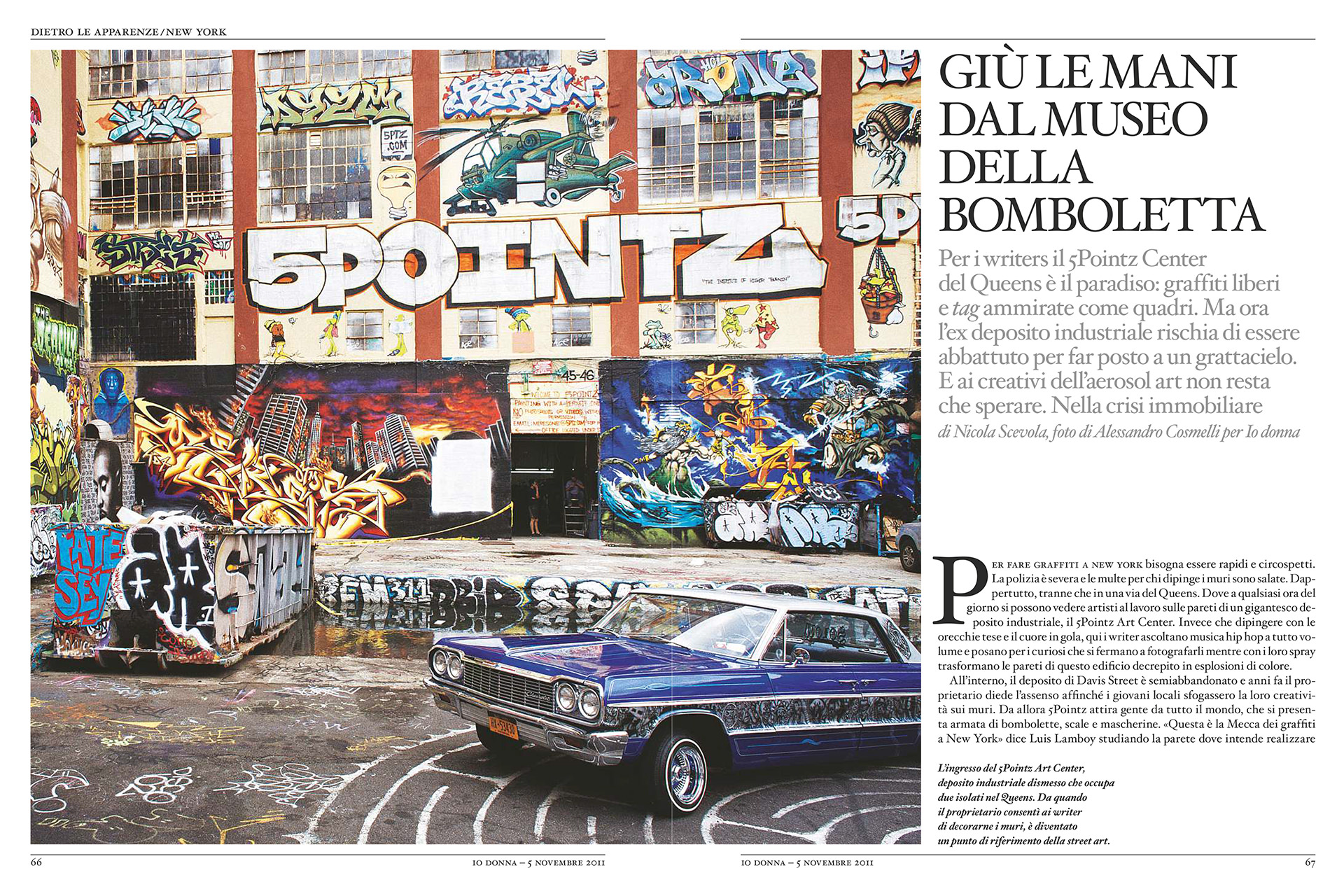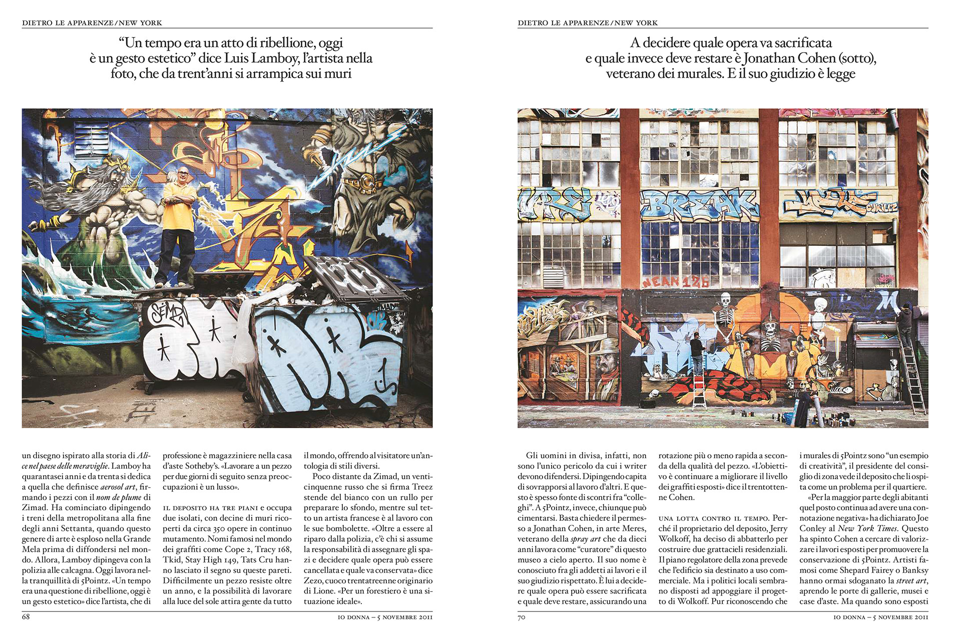 Per fare graffiti a New York bisogna essere rapidi e circospetti. La polizia è severa e le multe per chi dipinge i muri sono salate. Dappertutto tranne che in una via del Queens. Dove a qualsiasi ora del giorno si possono vedere artisti al lavoro sulle pareti di un gigantesco deposito industriale, il 5Pointz Art Center. Invece che dipingere con le orecchie tese e il cuore in gola, qui i writers ascoltano musica hip-hop a tutto volume e posano per i curiosi che si fermano a fotografarli mentre con i loro spray trasformano le pareti di questo edificio decrepito in esplosioni di colore. All’interno, il deposito di Davis Street è semi abbandonato e anni fa il proprietario diede il suo assenso affinché i giovani locali sfogassero la loro creatività sui suoi muri. Da allora 5Pointz attira gente da tutto il mondo, che si presenta armata bombolette, scale e mascherine. “Questa è la Mecca dei graffiti di New York”, dice Luis Lamboy studiando la parete dove intende realizzare un disegno ispirato alla storia di Alice nel paese della Meraviglie. Lamboy ha quarantasei anni e da trenta si dedica a quella che definisce aerosol-art, firmando i suoi pezzi con il nom-de-plume di Zimad. Ha cominciato dipingendo i treni della metropolitana alla fine degli anni Settanta, quando questo genere di arte è esploso nella Grande Mela prima di diffondersi in tutto il mondo. Allora, Lamboy dipingeva con la polizia sempre alle calcagna. Oggi preferisce lavorare nella tranquillità offerta da 5Pointz.