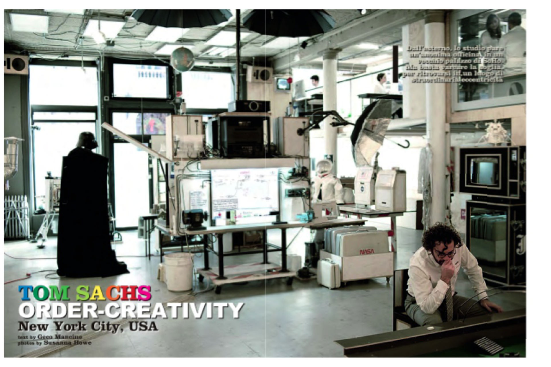 Dall’esterno, lo studio newyorkese dello scultore Tom Sachs sembra un’officina anonima, con una grata di ferro battuto che difende il piccolo ingresso al piano terra di un vecchio palazzo di SoHo. Varcata la soglia, però, l’eccentricità del posto colpisce l’occhio: i visitatori sono accolti da un mezzobusto di Dart Vader e ricevono una targhetta adesiva da applicare al petto con nome e foto, incorniciati dai simboli della Nasa e del governo americano. Qualche tempo fa, l’artista ha riprodotto nel suo studio lo sbarco sulla Luna e ha mantenuto alcune vestigia dell’impresa. Lo spazio è enorme per gli standard newyorkesi: circa 500 metri quadrati distribuiti su tre livelli, disseminati d’installazioni, materiali e attrezzi d’ogni genere. Nonostante l’abbondanza di oggetti, il laboratorio è un esempio d’ordine. Ci sono decine di cassetti e ripostigli divisi meticolosamente in base ai contenuti: viti, bulloni, punte dei trapani, cacciaviti sono ordinati per tipologia e riposti secondo un codice di colori. Anche i pennarelli sono perfettamente allineati in rastrelliere di legno costruite apposta. Appare subito chiaro che disciplina e ordine sono i principi che regolano la vita del laboratorio. E le parole del padrone di casa non fanno altro che rafforzare quest’impressione.
